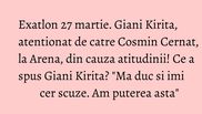 In momentul in care Giani Kirita vede ceva incorect, probabil ca atunci vad si un altfel de Giani Kirita.Daca se dovedeste ca am gresit cu ceva, ma duc si imi cer scuze. Am puterea asta. Eu nu cred ca am depasit limita cu ceva, nu putem sa fim toti la fel.