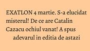 "Factura de maxilar, asta am la ochi mai exact. La picioare am o durere doar cand alerg si cand sunt pe traseu. Ma fortez putin cand joc, in timpul liber sunt ok. Sper sa-mi reziste corpul", a spus Catalin Cazacu, in editia EXATLON 4 martie.