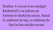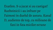 Kanal D a dominat podiumul audientelor aseara cu cea mai iubita competitie sportiva televizata, “Exatlon”, productia fiind urmarita de milioane de fani, in fiecare minut al difuzarii, pe parcursul celor trei ore de emisie.