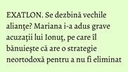 “Ionut ne-a mintit pe toti si a inceput sa se dea bine pe langa Stefan si Alina. El, care a spus ca a jucat fotbal, ieri nu s-a descurcat deloc. Eu il <miros>, am 43 de ani si imi dau seama. Mie nu-mi plac oamenii cu doua fete. (…) Daca ai fi slabit, ai dormi, ori asta nu-i dormit!”, si-a acuzat Mariana colegul de echipa.