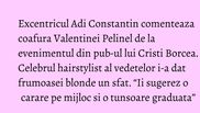 Excentricul Adi Constantin comenteaza coafura Valentinei Pelinel de la evenimentul din pub-ul lui Cristi Borcea. Celebrul hairstylist al vedetelor i-a dat frumoasei blonde un sfat. “Ii sugerez o carare pe mijloc si o tunsoare graduata”