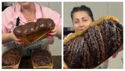 - Acum o să vă arăt cum o să împletesc și cozonacul tradițional. Întind foaia cam de 1 centimetru, ca și la Babka venim cu un strat generos de ciocolată pe care îl presăm bine și nucă. Acum secționăm la jumătate, părți pe care le rulăm, închiderea trebuie să fie dedesubt, împletim, îi punem pe foaia de copt și în tavă, iar acum o să îi las aproximativ 50 de minute la dospit, învelit în pungă și băgat la cuptor la 30 de grade.