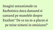 Anca a cantat si a dansat pe manelele lansate recent despre Exatlon, apoi a mers la poligon si a tras cu arma. S-a descurcat excelent, dandu-le clasa celorlalti doi "adversari".