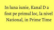 Continutul de calitate oferit telespectatorilor Kanal D s-a regasit si in audientele inregistrate pe intreaga luna iunie, pe segmentul de public National, in Prime Time 20:00 – 24:00, statia ocupand prima pozitie in clasamentul televiziunilor din Romania, cu 6,2% rating si 17,3% cota de piata. Pe tronsonul orar 18:00 – 24:00, pe segmental de public National, Kanal D a ocupat cea de-a doua pozitie in topul televiziunilor din Romania in luna iunie, cu 4,7% rating si 14,5% cota de piata.
