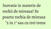 Pentru sezonul 2015-2016, una dintre cele mai inovative rochii de mireasa este un model “2 in 1” care “jongleaza” cu lungimile. Mai precis, aceasi rochie poate deveni din lunga scurta sau invers prin intermediul unui fermoar ascuns. In acest fel, poate fi purtata in varianta lunga, la biserica si la receptie, iar in cea scurta la petrecerea care dureaza, de obicei, pana dimineata. O astfel de rochie poate deveni o piesa vestimentara interesanta, chiar si dupa nunta pentru ca poate fi purtata ca o rochie de cocktail.