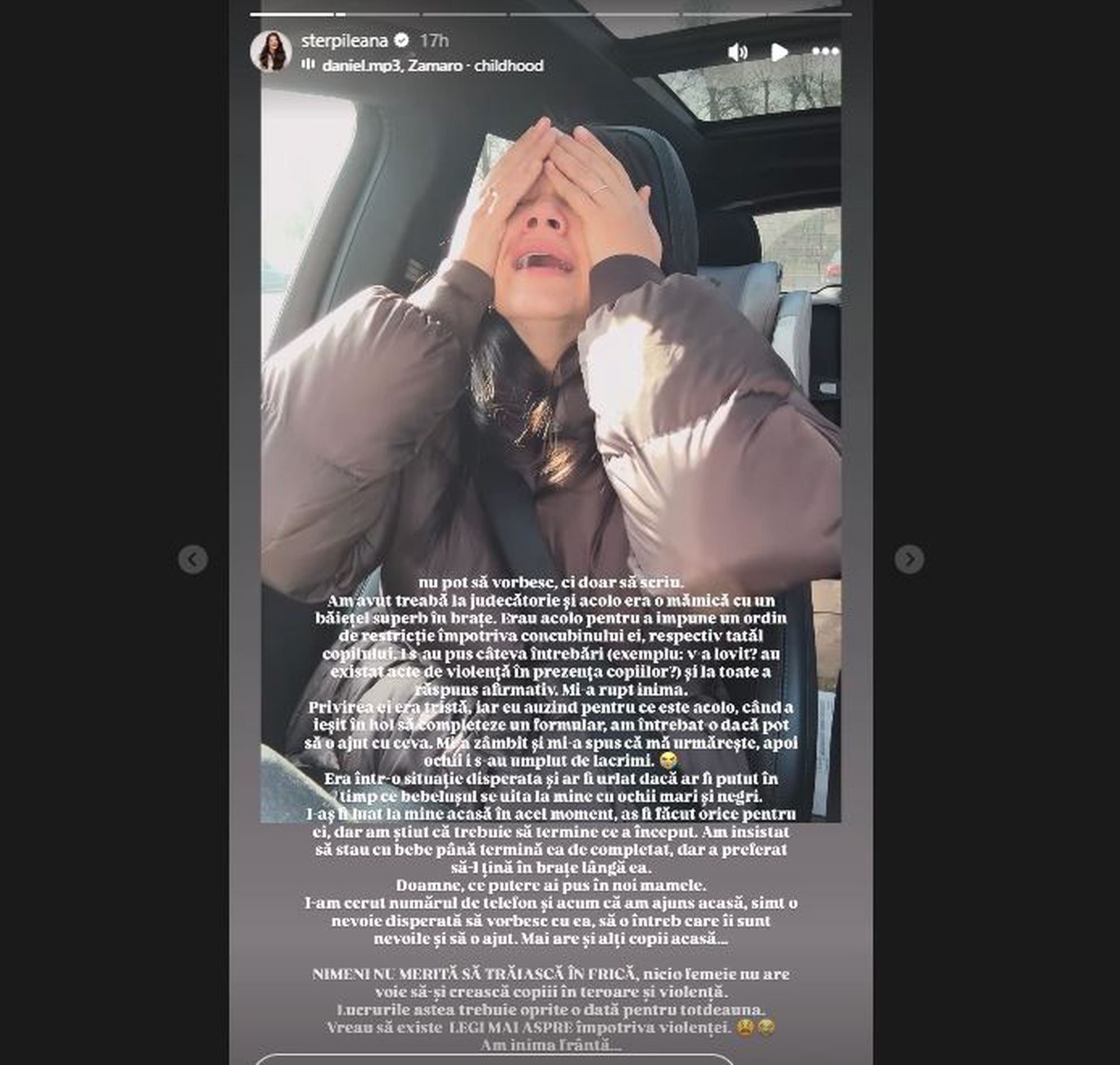 Mai are și alți copii acasă. Nimeni nu merită să trăiască în frică, nicio femeie nu are voie să-și crească copiii în violență. Lucrurile astea trebuie oprite o dată pentru totdeauna. Vreau să existe legi mai aspre împotriva violenței. Am inima frântă!”, a fost mesajul transmis de Ileana Sterp, pe pagina sa de Instagram.