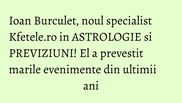 Ioan Burculet este un astrolog nu foarte cunoscut la noi in tara, desi cateva din previziunile sale importante s-au indeplinit. Acum el este nousl specialist Kfetele.ro in ASTROLOGIE si PREVIZIUNI.