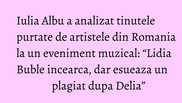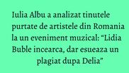 “Lidia Buble incearca, dar esueaza un plagiat dupa Delia. Cizmele sunt o copie grosolana, atitudinea e cusuta cu ata alba, dar macar incearca ceva… ceea ce este infinit mai bine decat pitiponceala stilistica in care se scalda inca de la inceputurile carierei sale pana acum. Nu incurajam in niciun caz plagiatul, asa incat ne abtinem. A se lua cu antivomitiv ”, ne-a declarat Iulia Albu.