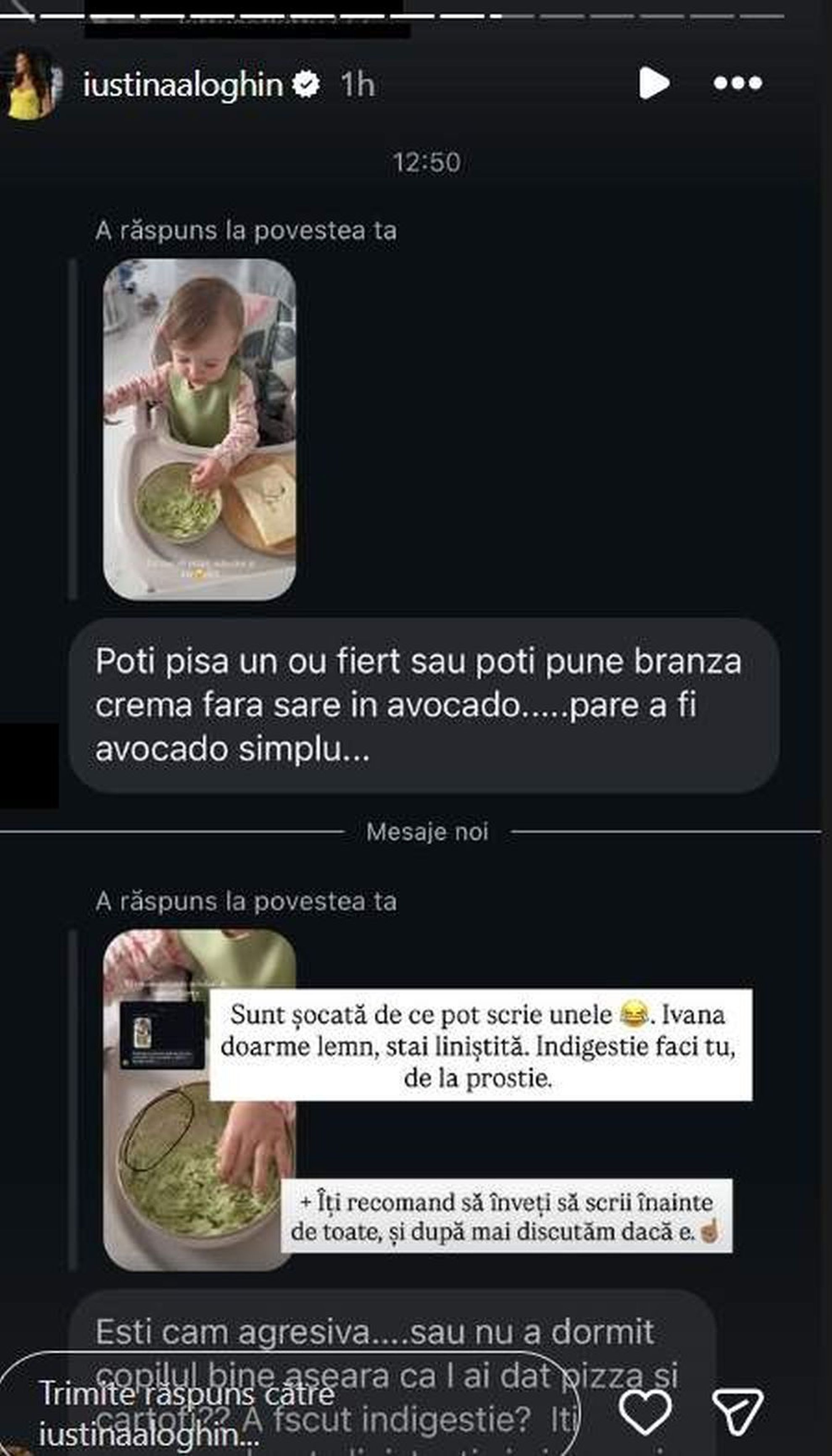 Deși a ales o variantă sănătoasă pentru fetița sa, Iustina Loghin a primit mai multe comentarii răutăcioase din partea celor care o urmăresc în care a fost criticată pentru mâncarea pe care a mâncat-o micuța. Astfel, o persoană i-a sugerat să îi adauge în avocado și ou fiert sau brânză fără sare, în timp ce alte persoane au spus că micuța ar putea face indigestie de la
