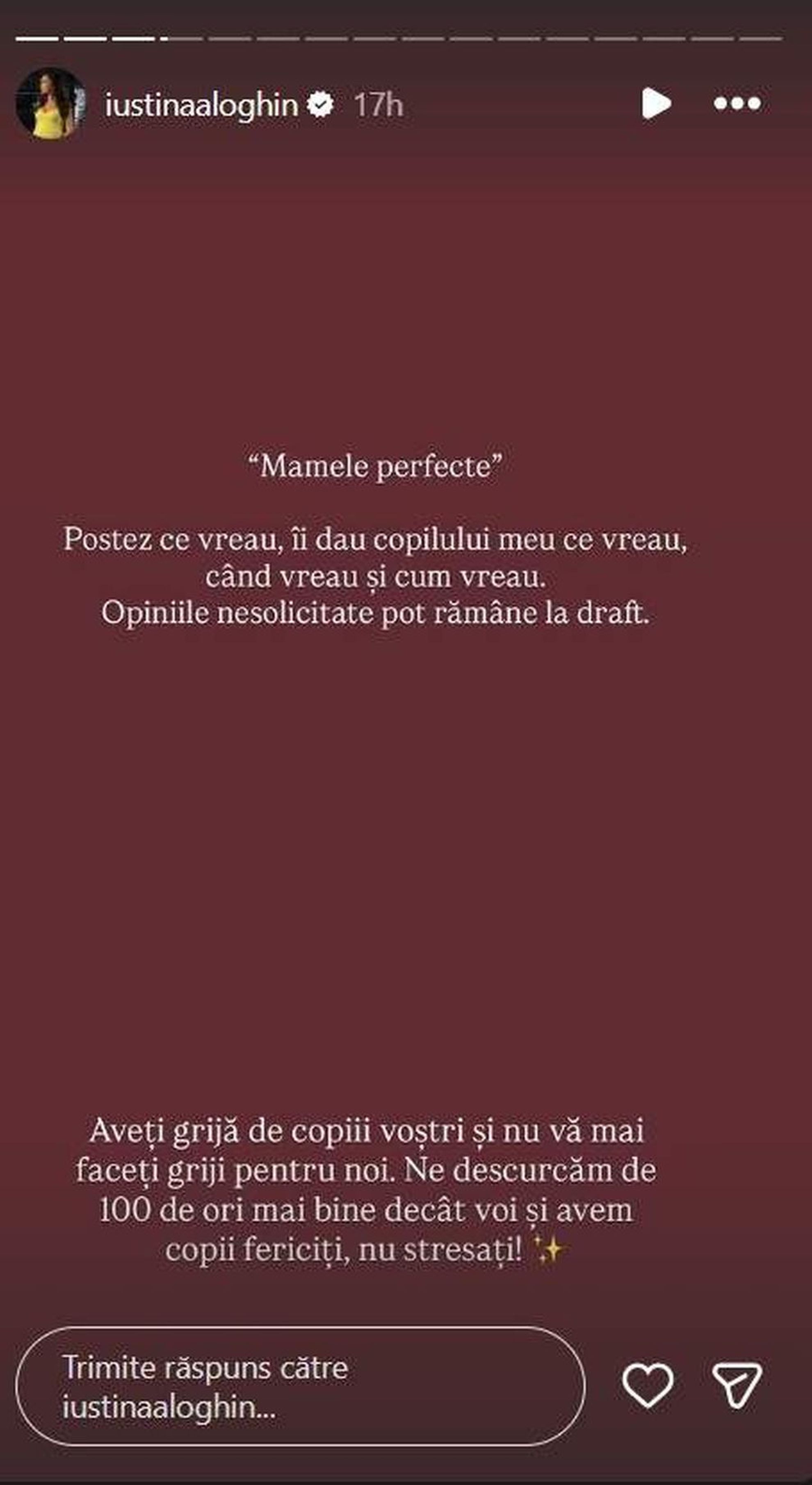 „ Mamele perfecte. Postez ce vreau, îi dau copilului meu ce vreau, când vreau și cum vreau. Opiniile nesolicitate pot rămâne la draft. Aveți grijă de copiii voștri și nu vă mai faceți griji pentru noi. Ne descurcăm de 100 de ori mai bine decât voi și avem copii fericiți, nu stresați!”, a scris Iustina, pe Instagram.