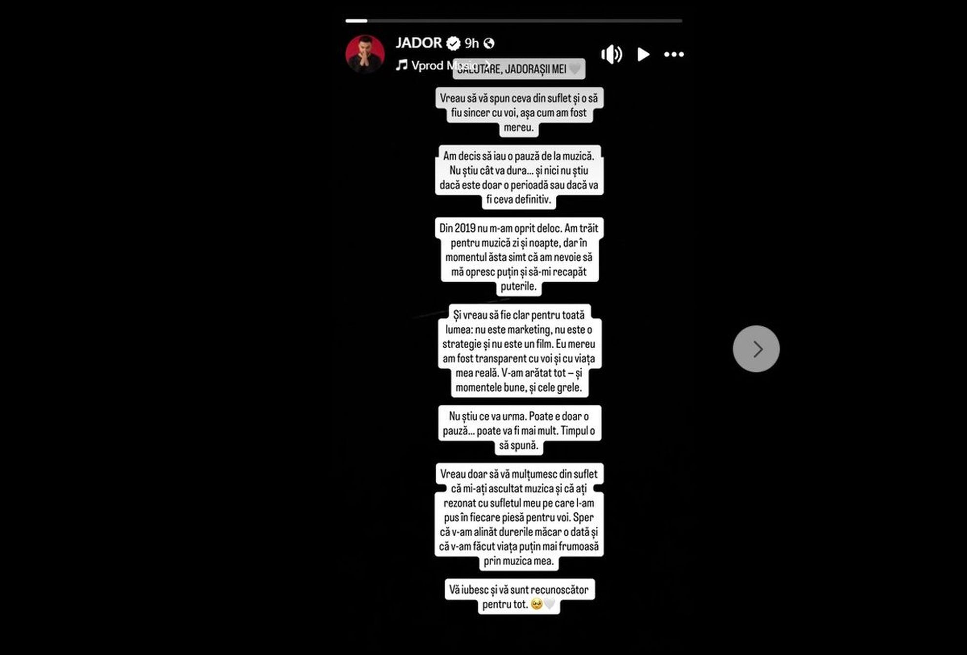 Am trăit pentru muzică zi şi noapte, dar în momentul ăsta simt că am nevoie să mă opresc puţin şi să-mi recapăt puterile. Și vreau să fie clar pentru toată lumea: nu este marketing, nu este o strategie şi nu este un film. Eu mereu am fost transparent cu voi şi cu viața mea reală. V-am arătat tot -şi momentele bune, şi cele grele. Nu ştiu ce va urma. Poate e doar o pauză… poate va fi mai mult.