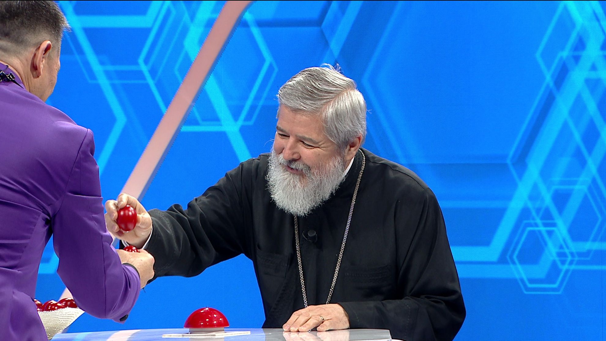 Rând pe rând, invitații speciali vin la pupitrul cuvintelor, ciocnesc ouă roșii cu prezentatorul și parcurg definițiile prezentatorului cu blândețe, voie bună și înțelepciune preoțească.