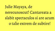 Julie Mayaya se lupta de cativa ani cu kilogramele in plus. Cantareata reusise la un moment dat sa scape de mai bine de 15 kilograme urmand un regim alimentar personalizat si facand kangoo jumps. Cum s-a lasat insa, a si pus inapoi kilogramele si a revenit la garderoba veche cu multi de X, scrie