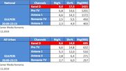 Aseara, in intervalul orar 20:00 – 23:15, Kanal D a inregistrat 8,0% rating si 17,3% cota de piata, pe targetul National, si 6,6% rating si 14,9% cota de piata, pe targetul All Urban, conform datelor furnizate de Kantar Media. O medie de aproape un milion si jumatate (1.421.000) de telespectatori din intreaga tara au urmarit aseara, in fiecare minut, serialul turcesc “Gulperi”.