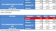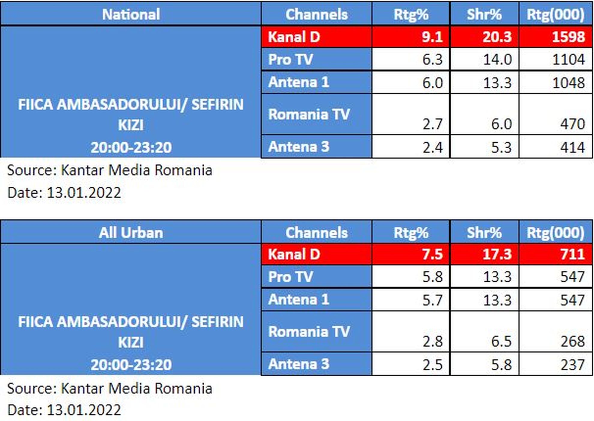 Joi, 13 ianuarie, Kanal D a fost lider de piață, în Prime Time, cu serialul fenomen “Fiica ambasadorului”, atât în rândul publicului din întreaga țară, cât și în ceea ce privește populația de la orașe. Conform datelor furnizate de Kantar Media, Kanal D a înregistrat o cotă de piață de peste 20% pe targetul Național, și peste 17% cota de piață, pe targetul All Urban, surclasând astfel celelalte stații concurente, în intervalul de difuzare a serialului “Fiica Ambasadorului”.