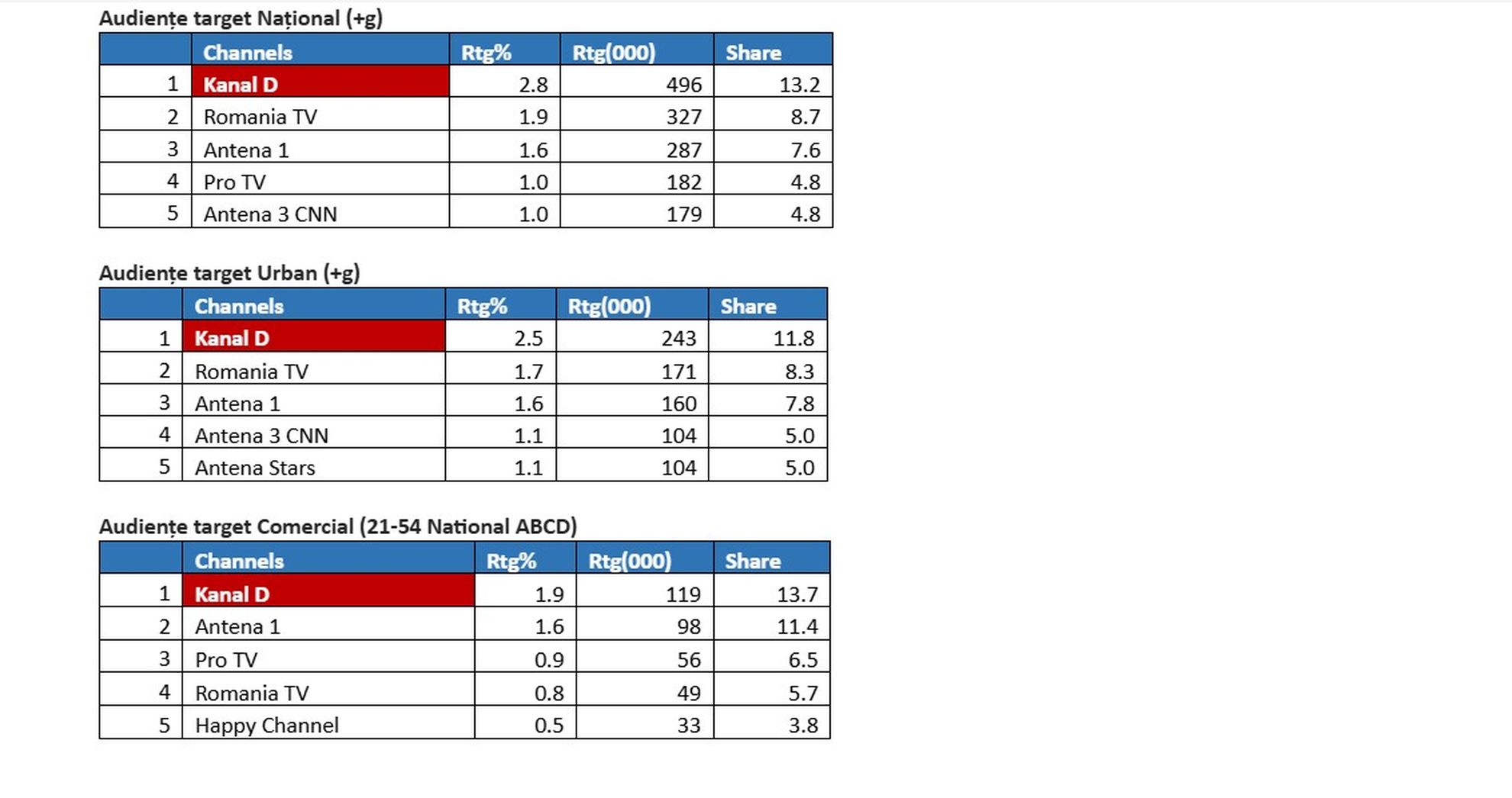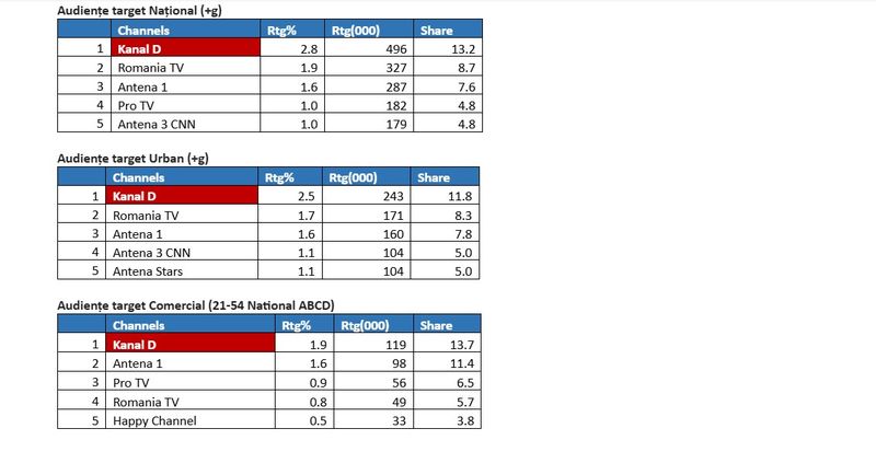 Duminică, 15 martie, emisiunea de reportaje „Asta-i România!”, prezentată de Mihai Ghiță, a poziționat Kanal D pe primul loc în topul audiențelor pe toate targeturile monitorizate, în intervalul 14:30 – 16:00, potrivit datelor furnizate de Kantar Media România.