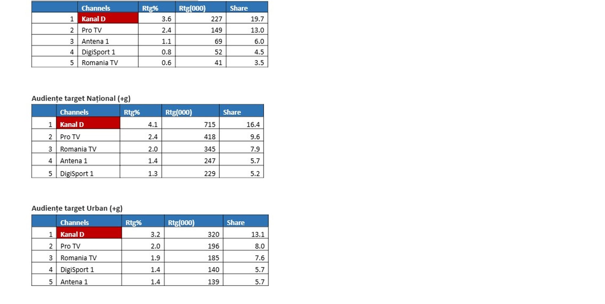 715.000 de telespectatori au urmărit stația Kanal D în intervalul 16:00-18:00, minutul de aur fiind înregistrat la 17:56, când 864.000
