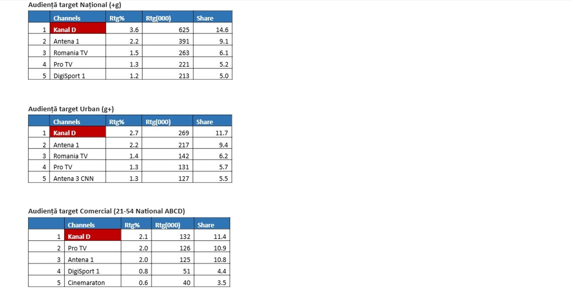 Duminică, 22 martie, emisiunea de reportaje „Asta-i România!”, prezentată de Mihai Ghiță, a poziționat Kanal D pe primul loc în topul audiențelor pe toate targeturile monitorizate, în intervalul 14:30 – 16:00, potrivit datelor furnizate de Kantar Media România.