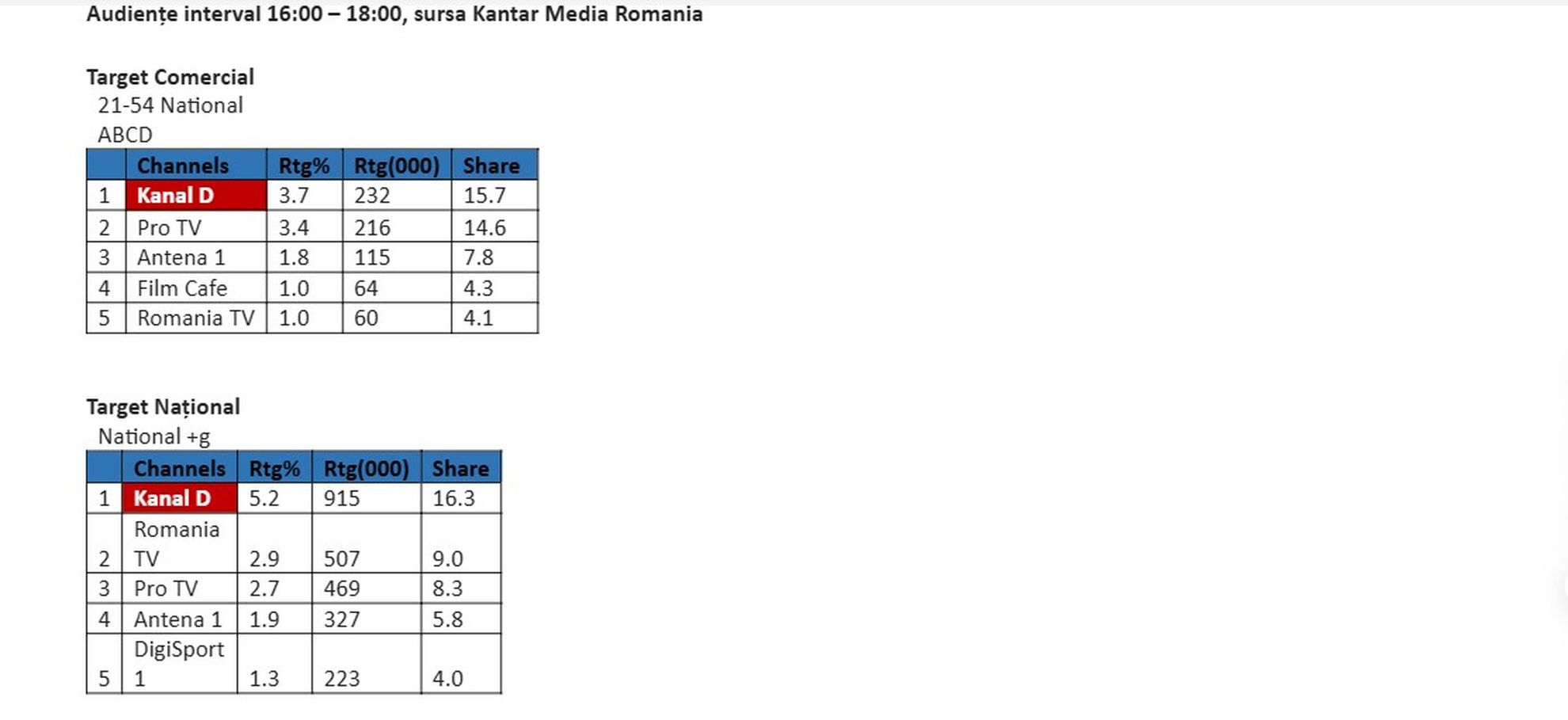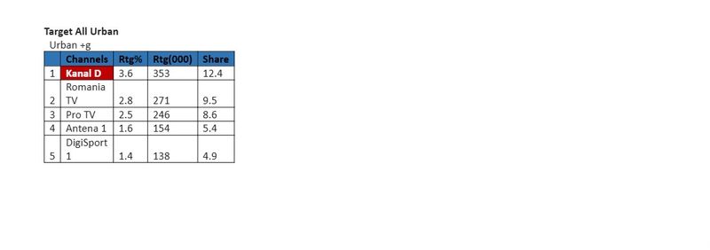 piaţă la nivelul publicului din mediul urban, asigurând locul 1 pe podiumul audienţelor, în intervalul mai sus menționat.