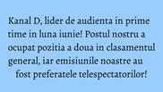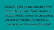 Tot in luna iunie, la nivel All Urban, Kanal D s-a clasat pe locul doi in topul televiziunilor din Romania, atat pe tronsonul orar 18:00- 24:00 (cu 4,2 rating si 12,6% cota de piata), cat si in intervalul 20:00- 24:00 (cu 5,4 rating si 15,1% cota de piata), conform datelor oficiale furnizate de Kantar Media.