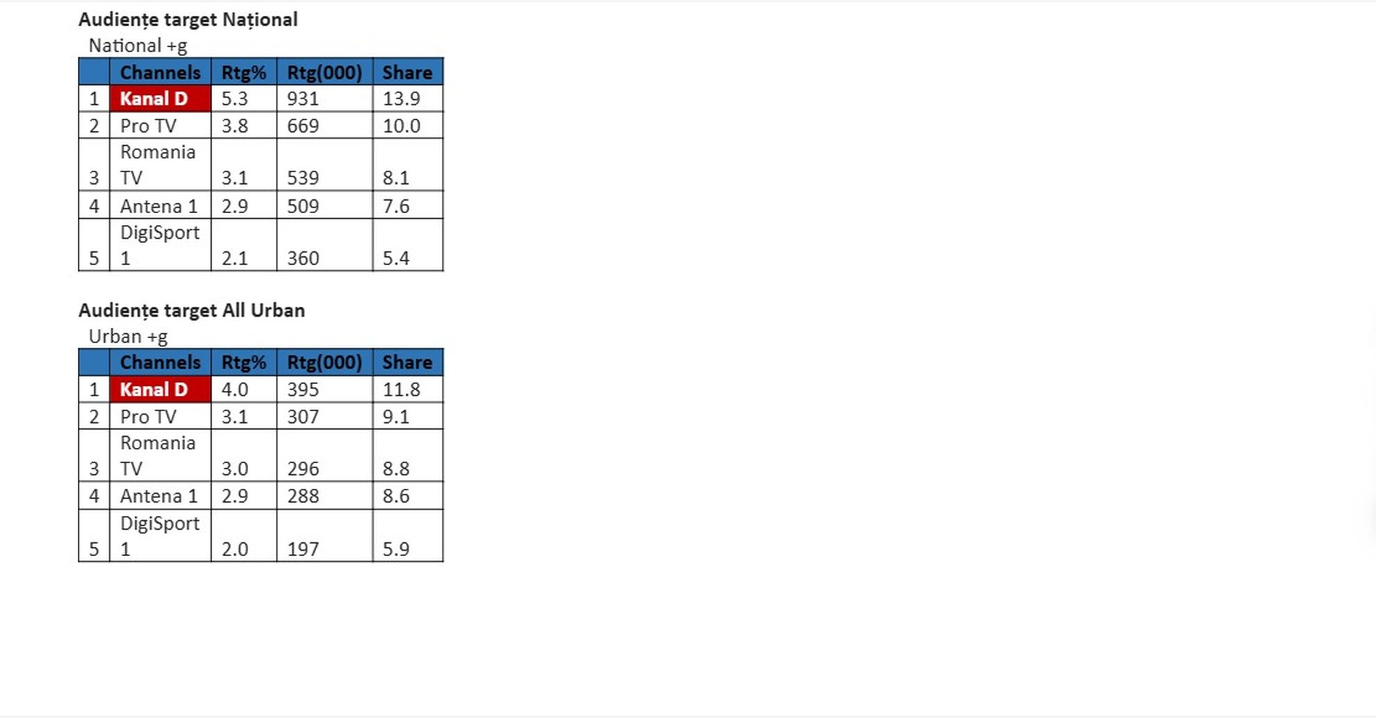 În intervalul difuzarii buletinului informativ Știrile Kanal D, 18:00-19:00, Kanal D a fost prima opțiune a telespectatorilor, înregistrând 5,3% puncte de rating și 13,9% cotă de piață, în rândul publicului din întreaga țară, și 4,0% rating și 11,8% cotă de piață, în rândul publicului de la orașe, surclasând astfel stațiile concurente.