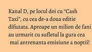 Minutul de maxima audienta, atins chiar la debutul editiei (22:30), a adunat in fata micilor ecrane aproape un milion (994.000) de fani ai emisiunii “Cash Taxi”.