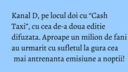Cea de-a doua editie a show-ului “Cash Taxi” difuzata aseara a pozitionat statia Kanal D pe locul doi la nivelul intregii tari, conform datelor furnizate de Kantar Media. Emisiunea prezentata de Catalin Cazacu a fost urmarita in medie, de peste jumatate de milion (524.000) de telespectatori din intreaga tara, pe intreaga durata de difuzare.