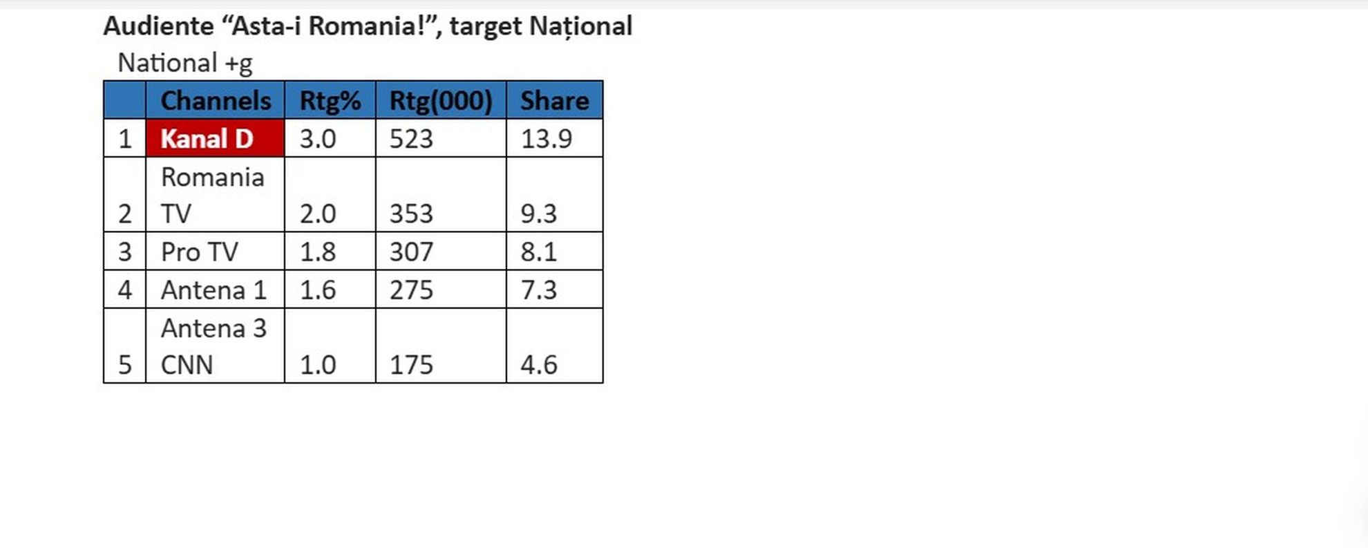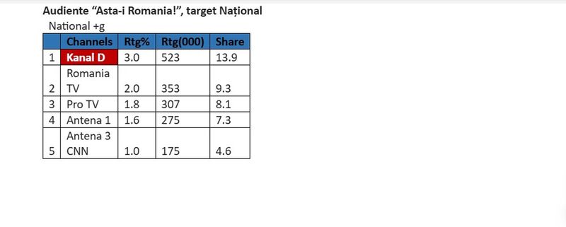 Duminică, 24 august, prima ediție a noului sezon al emisiunii “Asta-i România!”, una dintre cele mai longevive și îndrăgite emisiuni de reportaje, a fost prima opțiune a telespectatorilor români din întreagă țară, poziționând postul TV Kanal D pe primul loc în clasamentul audientelor, la nivel Național, conform datelor furnizate de Kantar Media România.