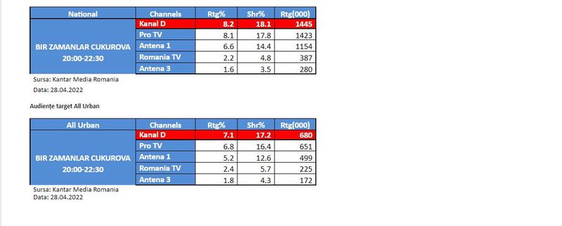 Serialul “Mă numesc Zuleyha” a poziționat aseară Kanal D pe primul loc în clasamentul audiențelor, la nivelul publicului din întreaga țară și de la orașe, conform datelor furnizate de Kantar Media România.