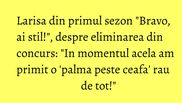 Cum Larisa a fost una dintre cele mai longevive concurente ale show-ul „Bravo, ai stil!”, sezonul I, si s-a bucurat, pe parcursul participarii in concurs, atat de admiratia juriului, dar mai ales de cea a publicului, moderatoarea emisiunii a vrut sa afle daca sunt lucruri pe care Larisa nu le-a spus pana acum si vrea sa le dea curs si, mai ales, cum s-a simtit tanara cand a fost eliminata.