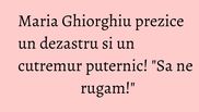 "20 Septembrie 2018, ora 6:13 dimineata! In aceasta dimineata, o lumina puternica precum un fulger, imi arata o incapere la Sud-Est, iar aici, in mijlocul incaperii se afla o masa goala care incepe a se clatina puternic. Dragii mei, vom auzi de un alt Cutremur puternic care nu va trece deloc neobservat. Noi stim ca Romania este ocrotita si ocolita de CUTREMURELE mari. Dar sa ne rugam pentru fratii nostri, pentru acei oameni care vor avea de suferit in urma acestui viitor Cutremur", este primul mesaj pe care Maria Ghiorghiu l-a scris.