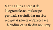 Marina Dina a adus pe lume, prin cezariana, la inceputul acestui an gemeni: Aria si Zian. Blondina a scapat de kilogramele acumulate pe perioada sarcinii repejor, mai ales ca nu s-a ingrasat foarte tare. Silueta sexy insa nu o mai are.