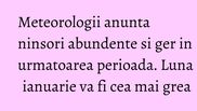 Vom avea ninsori abundente in zonele centrale si de vest, iar in restul tarii precipitatiile vor fi in normalul perioadei.