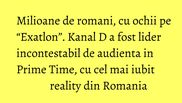 Aseara, in intervalul 20:18 – 23:10, Kanal D a inregistrat 10,4% rating si 25,7% cota de piata, pe targetul Comercial, 11,8% rating si 23,9% cota de piata, pe targetul National, si 10,0% rating si 21,1% cota de piata, in randul publicului de la orase.