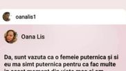 În urmă cu puțin timp, vedeta a transmis un mesaj înduioșător în mediul online, în care destăinuia că de cele mai multe ori simțea că nu mai poate, iar problemele deveneau tot mai serioase, însă reușea mereu să găsească un motiv de continua să meargă mai departe, astfel reușind să traverseze toate situațiile dificile. De asemenea, Oana Lis știe faptul că, deși zilele par să nu se mai sfârșească din cauza greutăților, la final apar zilele însorite, pline de bucurie și liniște sufletească.“Da, sunt văzută ca o femeie puternică și eu mă simt puternică pentru că fac multe în acest moment din viața mea și am învățat să mă susțin și pe mine, și pe alții. Fetița a devenit femeie. Dar e greu să fii puternic și să te arăți puternic. Cine trece prin asta știe cum e. Numai eu știu de câte ori am plâns la volan mergând.
