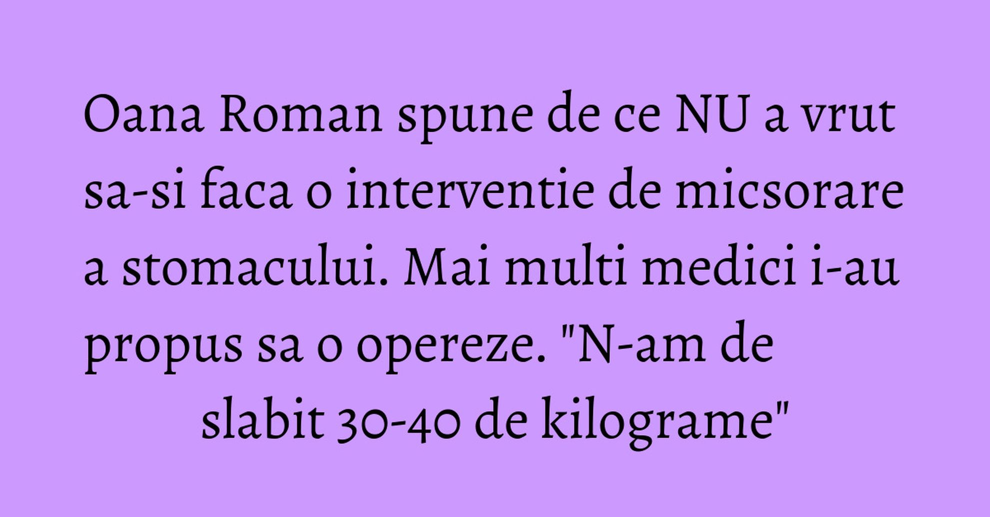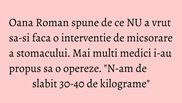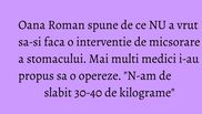 Trece o perioada si ma suna un realizator de televiziune sa-mi propuna sa fac aceasta operatie. Am spus ca nu vreau, eu nu am de slabit 30-40 de kilograme. E o operatie care poate avea repercusiuni si nu ma intereseaza sa fac acest lucru. Nu l-am facut. Puteam sa o fac, dar trebuia sa ma duc la televizor pentru chestia asta. Nu mi-am dorit niciodata sa fac aceasta operatie. Cunosc oameni care au facut aceasta interventie, dar intr-adevăr au probleme", a povestit Oana acum ceva timp.