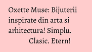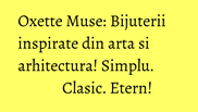 Fiecare piesa poate completa atat o tinuta de zi, cu jeans, cat si o “little black dress”, expresia elegantei pentru atat de multe femei. Pietre naturale semipretioase precum sidef, cristale, agate, labradorit, montate in argint simplu sau argint in baie de aur, au fost folosite la realizarea colectiei Oxette din acest sezon AW2014-2015- colectia Muse- bijuteria eterna, inspirata din arta, arhitectura si lucrurile simple ale vietii.