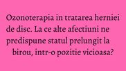 Acesta precizeaza ca in stadiile avansate ale bolii, administrarea de ozon se poate face intervertebral sau intradiscal, obtinandu-se in acest fel rezultate foarte bune pentru cura problemei respective. In plus, Dr. Mihai Baican atrage atentia asupra faptului ca statul prelungit la birou afecteaza oxigenarea tuturor tesuturilor: