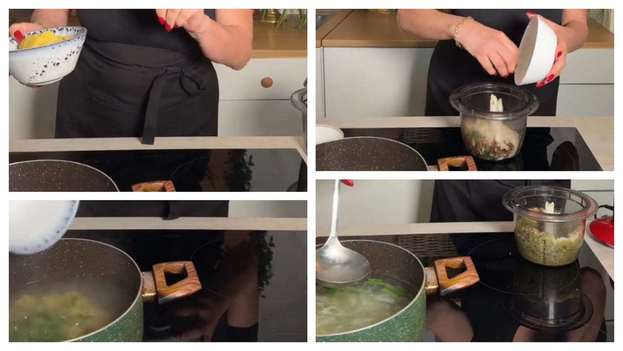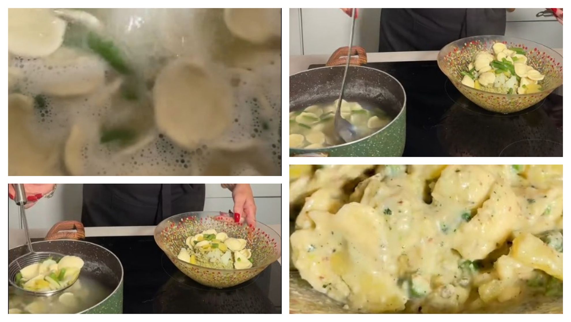 „Orecchiette cu pesto, puțin mai diferite. Pesto cu nuci, cartofi și fasole. Apa de la paste fierbe, acum punem cartofi, pe care i-am feliat subțiri, fasolea verde și lăsăm să fiarbă cam 6 minute. Între timp facem pesto. Facem cu nuci, e mai ușor să-l gătim. Am pus busuioc, nuci, parmezan, doi căței de usturoi și ulei de măsline. Blendăm. Mai punem puțină apă de la paste, pentru că e foarte tare. Îl punem în castronel. După ce cartofii și fasolele au fiert cam 6-7, adaug pastele, toate împreună. Acum le luăm și le punem în pesto și dacă ni se par prea uscate, mai luăm puțină apă de la paste. Pastele noastre cu pesto special și puțin diferite sunt gata.”, a spus chef Patrizia Paglieri.