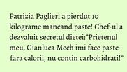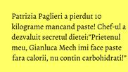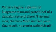 In ultimul an, Patrizia Paglieri, celebrul MasterChef din emisiunea de gatit a reusit sa-si slefuiasca corpul aducandu-l la dimensiunile din adolescenta. Desi multi si-ar putea imagina ca in spatele transformarii sale uluitoare se afla o dieta super drastica, in realitate procesul de slabire nu a fost atat de restrictiv. Totul se datoreaza nutritionistului Gianluca Mech, prietenul italian al Patriziei Paglieri, cunoscut in toata lumea pentru retetele sale de slabit, bazate pe plante, dar si pentru pastele fara carbohidrati pe care el le-a inventat.