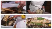 - Peștele e gata, se vede că e ușor rumen. Spanacul este și el gata, este ușor tras prin tigaie cu unt, deci verde, frumos, este proaspăt cules, dar și aici puțin l-am tras prin tigaie și acum o să facem un pat din acest spanac. Peștele îl punem deasupra și cu niște fulgi de arahide, stropim deasupra și băgăm la cuptor. De acum spanacul îl punem în vas, formăm așa un pat pentru pește, așezăm și peștele. Punem rozmarin proaspăt de la noi din curte, băgăm o crenguța ușor în interiorul peștelui. Punem și puțin usturoi se poate pune și usturoi granulat, dar mie îmi place să folosesc usturoi, deasupra punem niște fulgi de migdale și urmează să dăm la cuptor 10-15 minute, până când ușor își schimbă culoarea arahidele, la 180°C, deci nu la foc puternic, nu trebuie decât puțin să prindă savoarea și a rozmarinului și a fulgilor care sunt deasupra. Vasul este gata, îl băgăm la cuptor și așteptăm.
