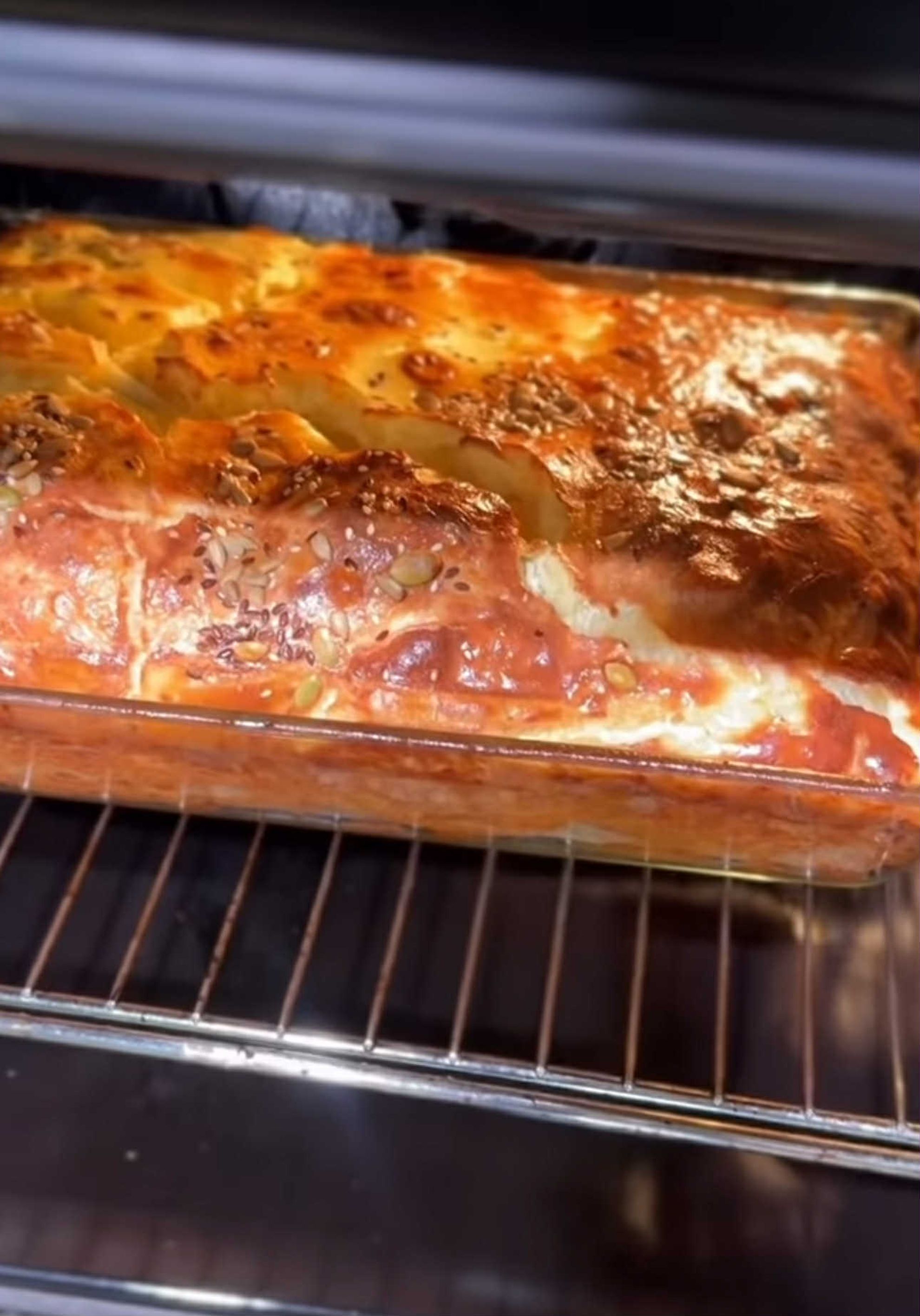 Majda a postat în mediul online rețeta unei plăcinte cu brânză, smântână și iaurt grecesc și începe cu preîncălzirea cuptorului. Pentru acest preparat aveți nevoie de foi, iar într-un bol amestecați smântâna, telemeaua, ouăle și iaurtul grecesc. Odată ce compoziția este gata, luați foaie cu foaie, peste care puneți umplutura, apoi repetați procesul cu câte foi doriți. La final, pentru decor, se adaugă câteva semințe și se coace aproximativ 45 de minute, până devine aurie.