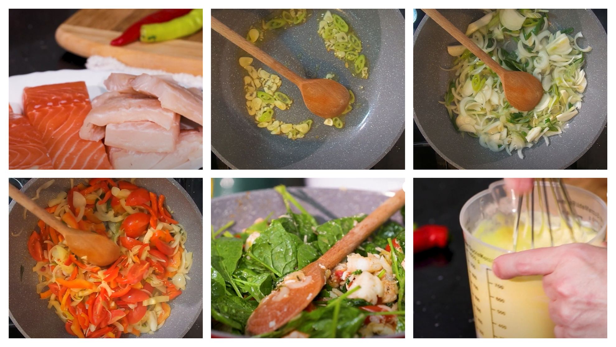 - Eu va trebui să pregătesc și peștele. Folosesc un șalău de Dunăre, un somon și niște creveți, doar tăiem mai mare, pentru că bucățile oricum o să se strângă puțin când dau de căldură. Pentru acest tip de plăcintă, a se evita oasele, este foarte important. (…) Adăugăm șalăul, somonul (n.r. în tigaie), doar să se pătrundă cumva pe jumătate și legumele. (…) O să adaug și creveții, care sunt prefierți. (…)