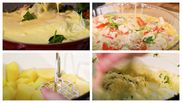 - Acum va trebui să ne ocupăm puțin de piure, pentru că piureul vreau să-l complic puțin, adică am ales niște cașcaval, îl zdrobesc. Trebuie să fie un piure țărănesc (…) semi grunjos, decât că o să vin cu telemea sărată, un pic de smântână dulce, mărar și pătrunjel. (…) Așa cum arată piureul, este foarte bine (n.r. îl punem deasupra peste compoziția din tavă). (…)