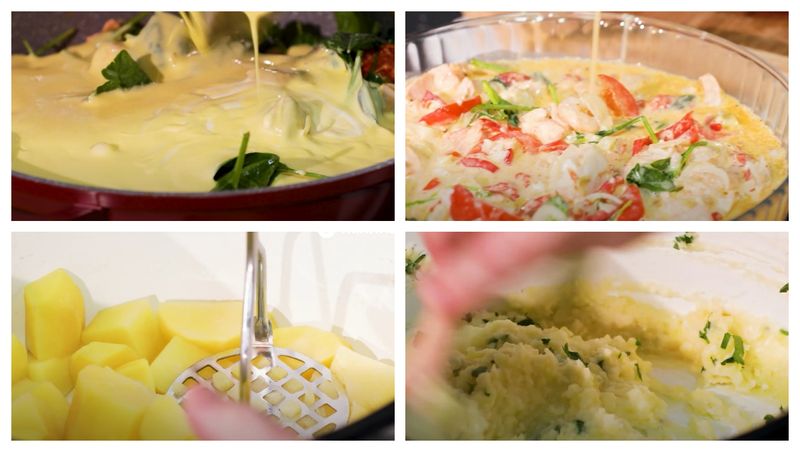 - Am terminat, o să iau de pe foc, pentru că va trebui să las să se tempereze puțin. Între timp o să îmi sparg 4 ouă pe care le introduc în smântână dulce și eventual o să vin și cu puțin smântână fermentată. (…) Adăugăm peste legumele pe care le-am sotat cu atenție, iese așa un fel de tocăniță care va fi turnată într-un vas termorezistent. (…) Facem cumva să fie cam 3 sferturi din vas cu compoziția asta de plăcintă, baza și să ne lăsăm la suprafață doar cu cât este necesar pentru a veni cu piureul la sfârșit. (…)