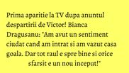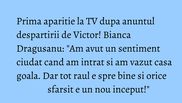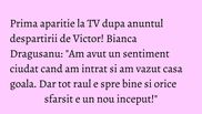 Am avut un sentiment ciudat cand am intrat si am vazut casa goala. Dar tot raul e spre bine si orice sfarsit e un nou inceput!", a spus Bianca Dragusanu astazi in emisiunea ei de la Kanal D, Te vreau langa mine.