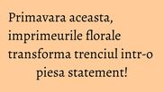 Iar sezonul acesta, trenciul cu imprimeuri florale este exact acea piesa statement pe care o cautai, pentru a scoate din anonimat eterna pereche de jeans, in combinatie cu un tricou. Sau, poti opta pentru bomber jacket cu imprimeu floral, pentru un efect similar.