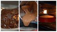 Adăugăm și 140 de grame de zahăr peste albușuri, 2 plicuri de zahăr vanilat, compoziția de gălbenuș, ciocolata cu untul topit, iar într-un vas cernem 25 de grame de cacao cu 100 de grame de făină. Adăugăm și acestea în compoziție. Preîncălzim cuptorul la 170 de grade, sus și jos, fără ventilație. Adăugăm compoziția într-o formă rotundă și între timp mergem pe foc să topim ciocolata. Avem nevoie de 400 de grame de frișcă lichidă cu 400 de grame de ciocolată pe foc și după ce s-au topit, le blendăm cu frișca rece lichidă.