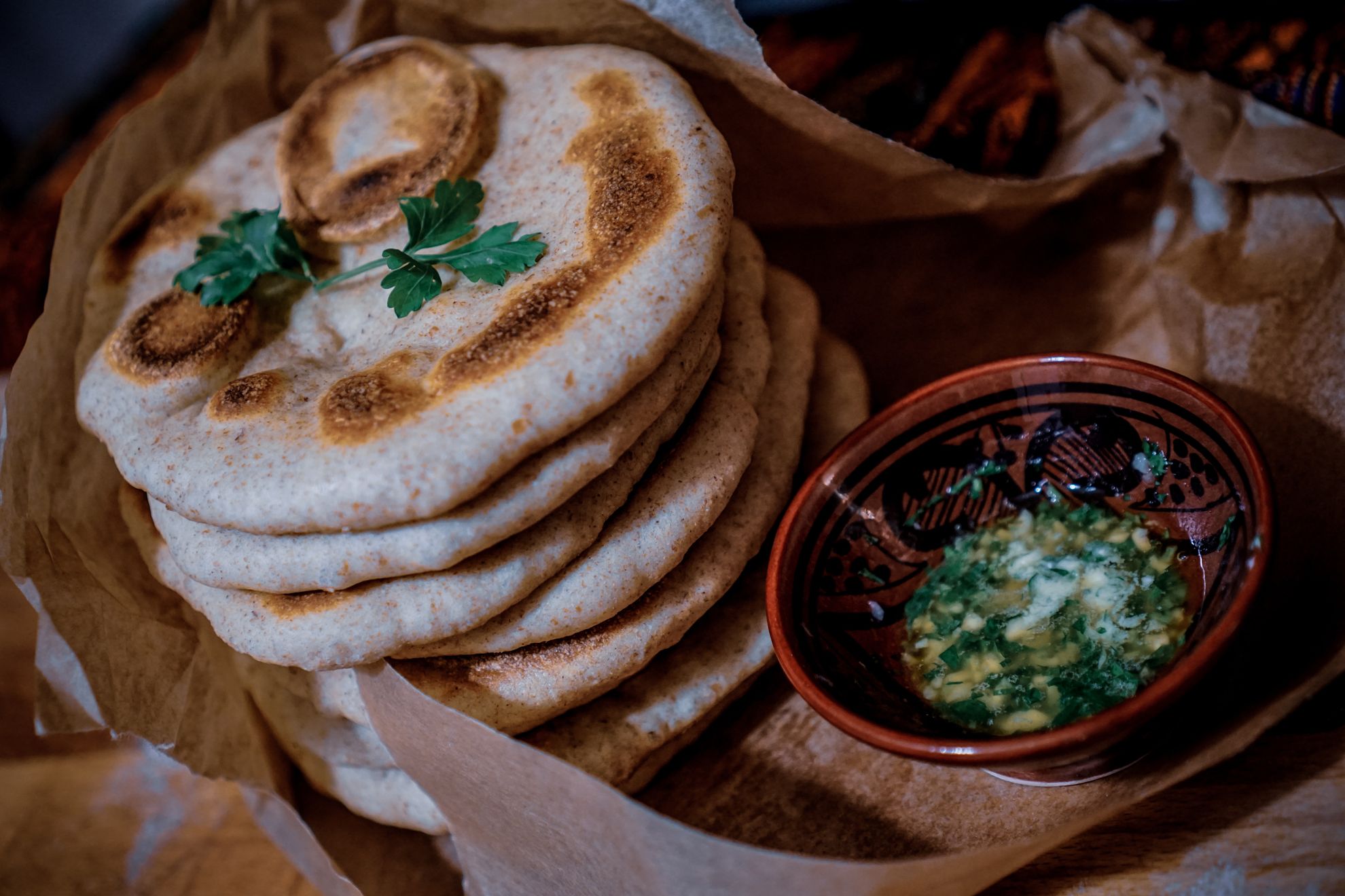 Pasul 7. Până ce turtele se mai răcesc puțin, putem să preparăm și un mujdei de usturoi cu verdeață, pentru a-l servi alături de preparatul nostru de astăzi. Așadar, vom avea nevoie de 2 căpățâni de usturoi, pe care le vom zdrobi bine de tot, direct într-un bol de dimensiuni mai mici. Peste usturoi vom adăuga și sare (după gust) și începem să îl pasăm, pentru a-l sfărâma mai bine. În continuare, vom adăuga și 2 linguri de ulei, dar și cele 150 de mililitri de apă. Amestecăm bine de tot, iar între timp, tocăm mărunt și jumătate de legătură de pătrunjel proaspăt, pe care ulterior o vom adăuga în bol. Amestecăm încă puțin, iar rețeta este gata!