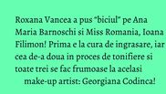 Roxana Vancea: M-am machiat singura o singura data! Venind aici (la Academia de make-up Georgiana Codinca) teoria o stiu, dar acasa m-am machiat intr-o zi singura cand am vrut sa imi fac smooki cu negru. Cand am intrat aici, in sala, mi s-a spus: ce ai, fa la ochi si mi s-a dat un servetel umed sa ma sterg. Nu e pentru mine treaba asta. Nu concept, nu stiu. Sa tin un ochi inchis si sa ma fac la celalalt mie mi se pare ireal.